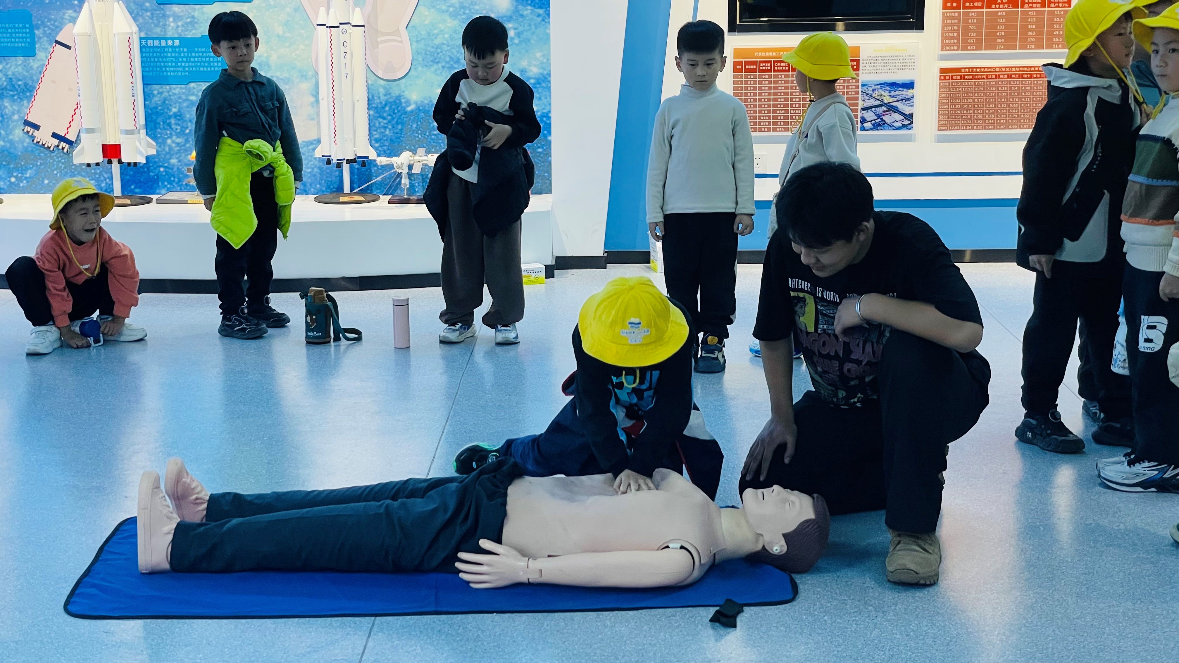 应急救护环节中,具备红十字救护资质的党员教师利用模拟人演示心肺复苏步骤,并指导孩子们进行按压练习,在他们心中播下了“人人学急救,急救为人人”的种子。