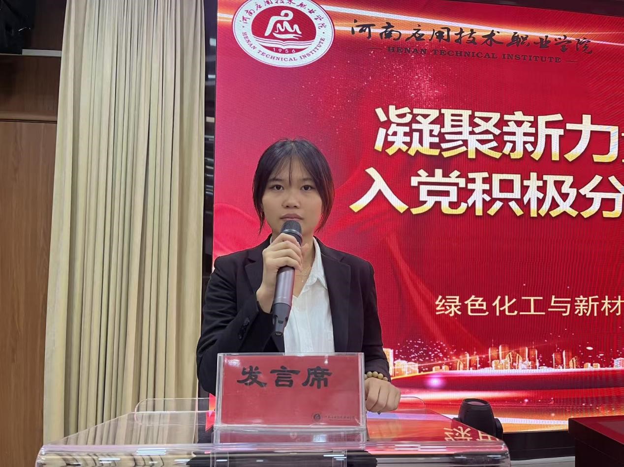 随后,化工2403班王梦梦同学作为本期学员代表发言。她结合个人学习成长经历,真诚讲述了积极向党组织靠拢的思想历程和热切愿望,表达了对党的深厚感情和坚定不移的追随决心。她代表全体学员郑重承诺,将以饱满的热情、端正的态度投入培训学习,严格遵守纪律要求,认真参与各项活动,努力提升理论水平和思想觉悟,争取在思想与行动上早日符合党员标准。
