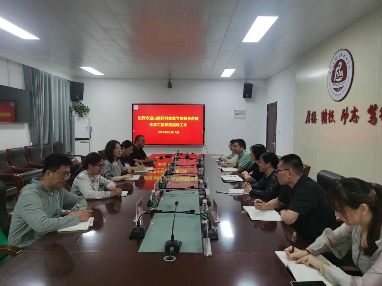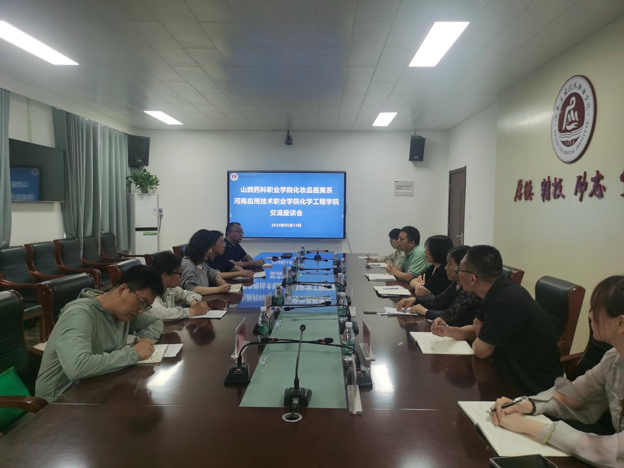5月14日,山西药科职业学院化妆品医美系党总支书记范张姣、主任贾文雅,中药系主任蔡翠芳教授等一行5人到beat365官网开展调研交流,beat365官网党总支书记陈永惠,副院长岳瑞丰、柴凤兰出席,化妆品专业骨干教师参加了交流座谈。