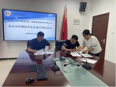 2023年6月13日,beat365官网与郑州宏科新材料有限公司举行校企合作签约仪式,院长朱冰、校科外处处长袁清香、副院长柴凤兰,郑州宏科新材料有限公司总经理尚龙飞等出席签约仪式。