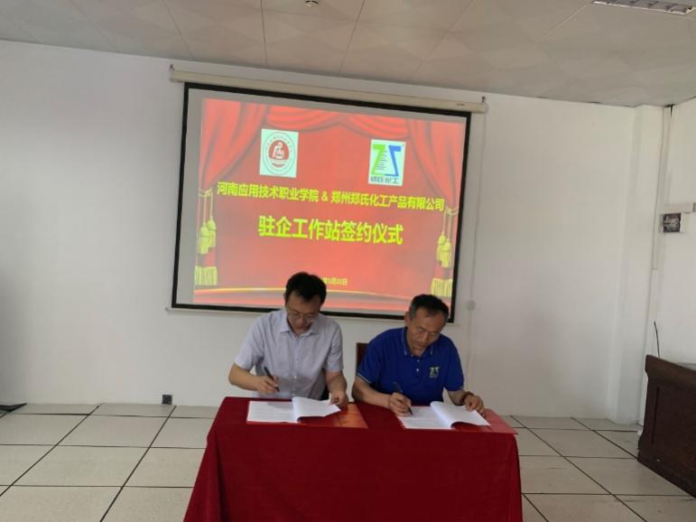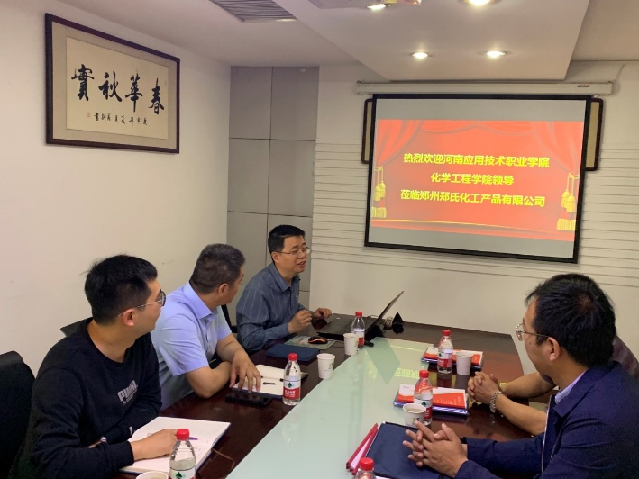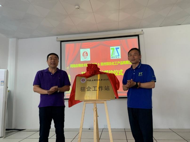 5月22日,beat365官网beat365在线唯一官网朱冰院长、蔡庄红书记等一行四人赶赴郑州郑氏化工产品有限公司举行校企合作签约暨“驻企工作站”揭牌仪式。
