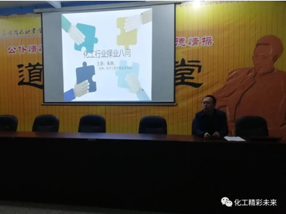 会议开始,朱冰书记简单介绍了现在化工行业的大背景,并分析了大家在择业前会出现的一些负面情绪,指出要和自身实际相结合,有目的地进行选择。然后围绕着八个问题解释了就业会出现的问题,分别是前景问、工作环境问、薪水问、跳槽问、职业规划怀疑问、书本问、技术升值问、女生问,这些问题基本涵盖了就业时会出现的种种情况。