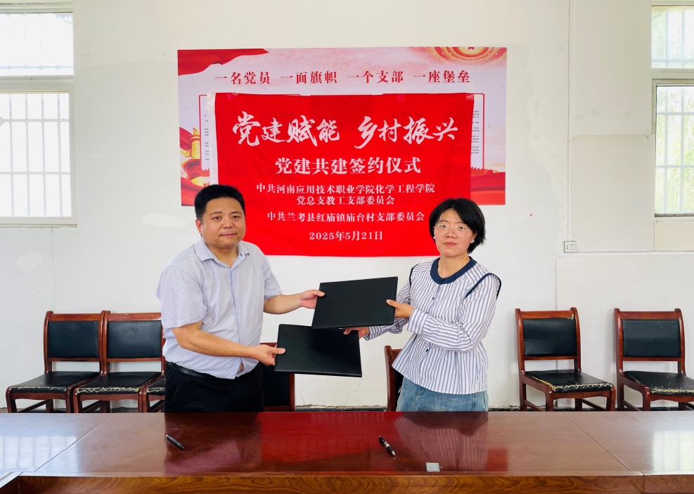 活动结束后,中共beat365在线唯一官网党总支教工支部委员会与中共兰考县红庙镇庙台村党支部委员会签订《乡村振兴技术帮扶协议》,推动专业与产业对接、教学过程与生产过程对接,在党建赋能乡村振兴的同时,进一步提升应用化工技术高水平专业群建设。beat365在线唯一官网党总支书记陈永惠、党总支副书记常惟诚、副院长岳瑞丰,协管员范雨欣及驻村第一书记任旭凯、队员李盈、陈开友等共同参与签约活动。