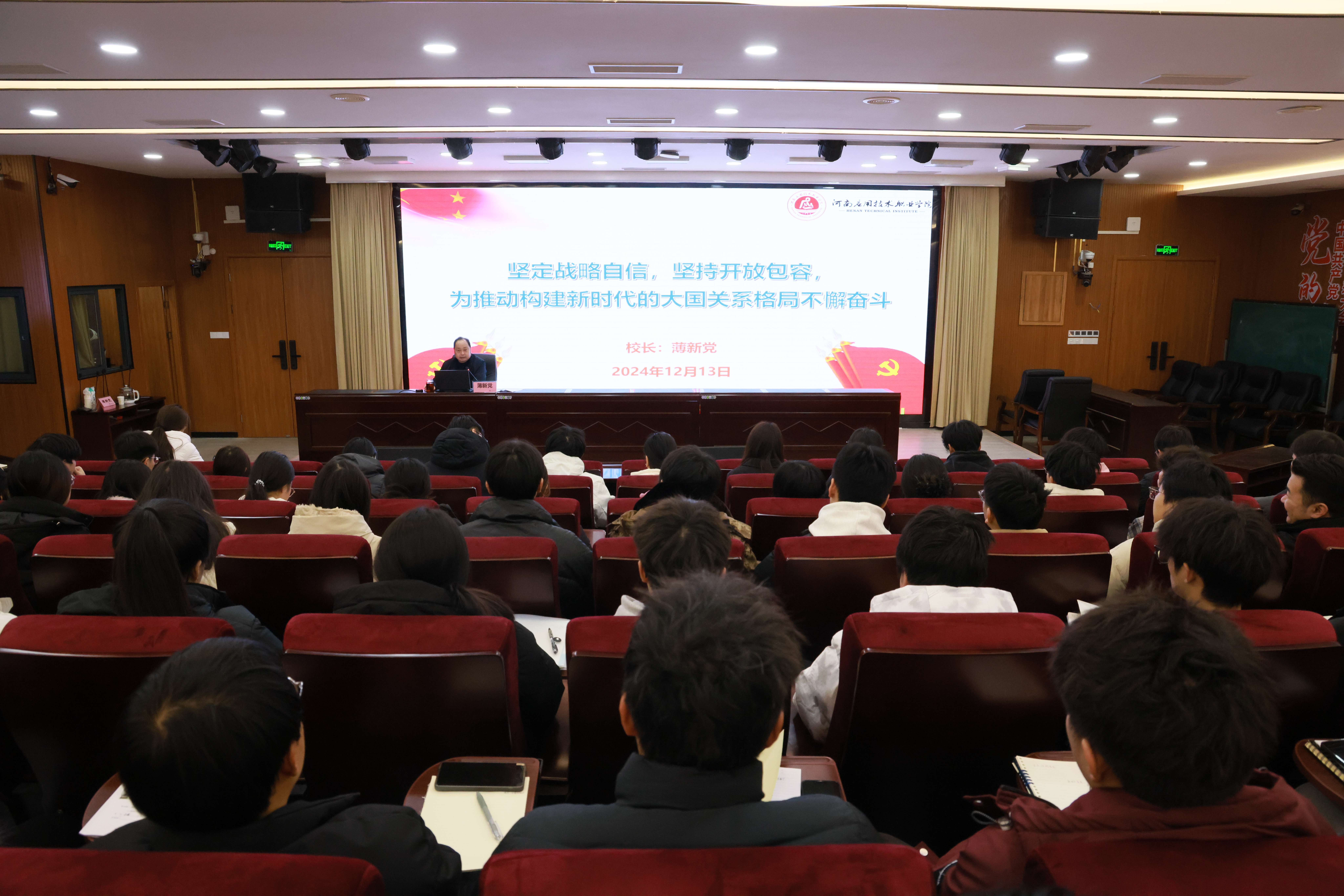为深入学习贯彻中共中央关于进一步全面深化改革、推进中国式现代化的决定会议精神,推动学校思想政治教育与国际发展紧密结合,切实落实立德树人根本任务,培养具有全球视野和社会责任感的新时代青年。2024年12月13日,校长薄新党以《坚定战略自信,坚持开放包容,为推动构建新时代的大国关系格局不懈奋斗》为题在郑州校区思政大讲堂为beat365在线唯一官网入党积极分子讲授专题思政课。beat365在线唯一官网入党积极分子代表参加。
