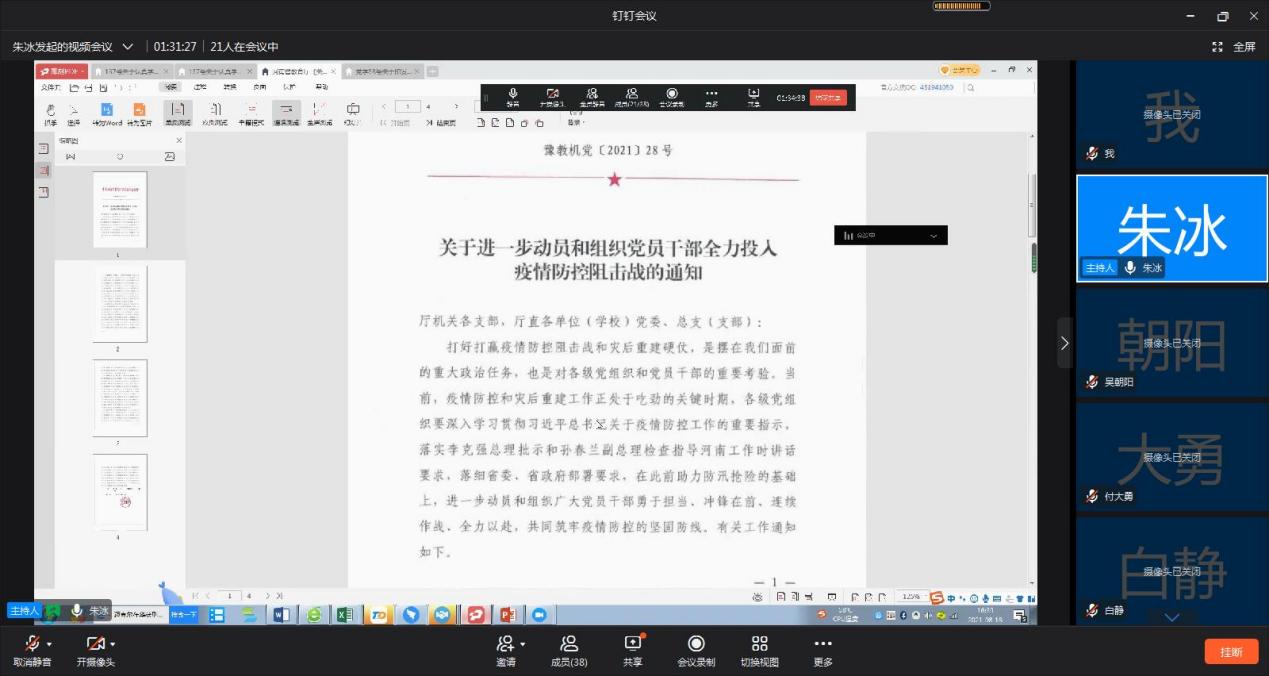近期新郑州冠肺炎疫情形势变化,根据校党委要求,2021年8月18日,beat365在线唯一官网党总支组织召开了学习《关于进一步动员和组织党员干部全力投入疫情防控阻击战的通知》线上专题会议,学院全体教职工参会。会议由院长朱冰主持。