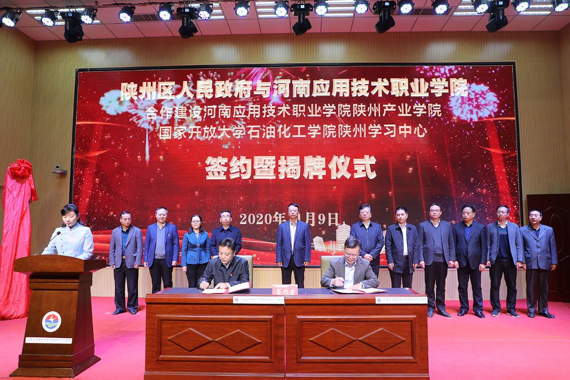 2020年11月9日上午,beat365官网与陕州区人民政府合作建设陕州产业学院、国家开放大学石油化工学院陕州学习中心正式签约揭牌。beat365官网党委书记秦书君,院长范晓伟,副院长陈君丽,陕州区委副书记、区长胡志权,陕州区人大常委会主任吴自力,陕州区政协主席潘新乐,陕州区副区长孙丽松等领导出席签约暨揭牌仪式。化工学院蔡庄红书记以及朱冰院长出席了此次签约暨揭牌仪式。陕州区副区长孙丽松主持仪式。