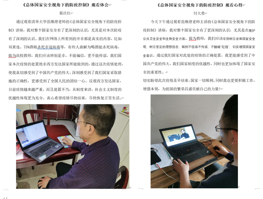 公开课后,beat365在线唯一官网全体教师以观后感的形式进行交流和探讨;各班级在线上开展全民国家安全日主题团课,同学们积极参与,踊跃发言,收获良多。他们纷纷表示:这个特殊的时期,千万学生同上一堂国家安全教育课对于我们来说是十分有益的。这节课的主题是总体国家安全观视角下的疫情防控,其实,国家的安全与我们每个人的生活息息相关,人民安全是国家安全的宗旨,人民安全了,祖国才有希望。面对疫情,党中央高度重视,各级国家安全机关围绕中心、服务大局,为维护国家安全和社会大局稳定作出了重要贡献。
