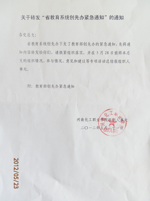 接到组织人事处《关于转发“省教育系统创先办紧急通知”的通知》,现转发给大家,请认真阅读,积极参与。