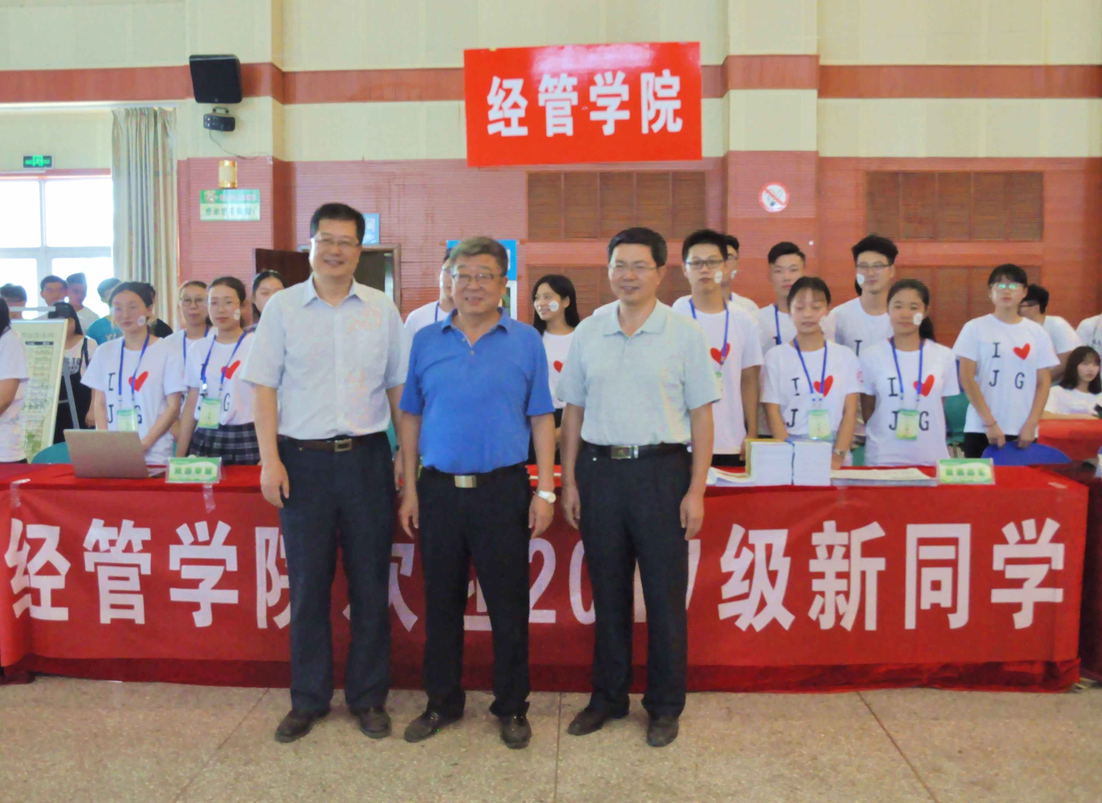必赢官网负责迎新工作的学生干部们统一着装印有“我爱经管”字体的T恤,脸上贴着由学生自己设计的印有“经管萌新”图案的贴纸,认真细致,朝气蓬勃的进行着准备工作,现场井井有条。吴普特行至经管学院报到区域前,充分肯定了经管学院迎新准备工作的高效、认真,饶有兴趣地翻阅了学工干部为新生和家长们准备的《大学生成长手册》及《成长手册》家长版后对此项工作表示认可。同时,希望迎新的学生干部们能以饱满的热情保证迎新工作圆满进行。吴普特还指出,经管学院是学校人数最多的学院,工作量大,任务繁重,更需要大家打起精神,精诚团结。视察后,校领导与必赢官网团学干部合影留念。