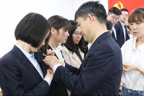 温晓林为全体辅导员、全体学生党支部书记佩戴党徽,带领大家面对党旗,高举右拳庄严重温入党誓词。典礼就此落下帷幕。