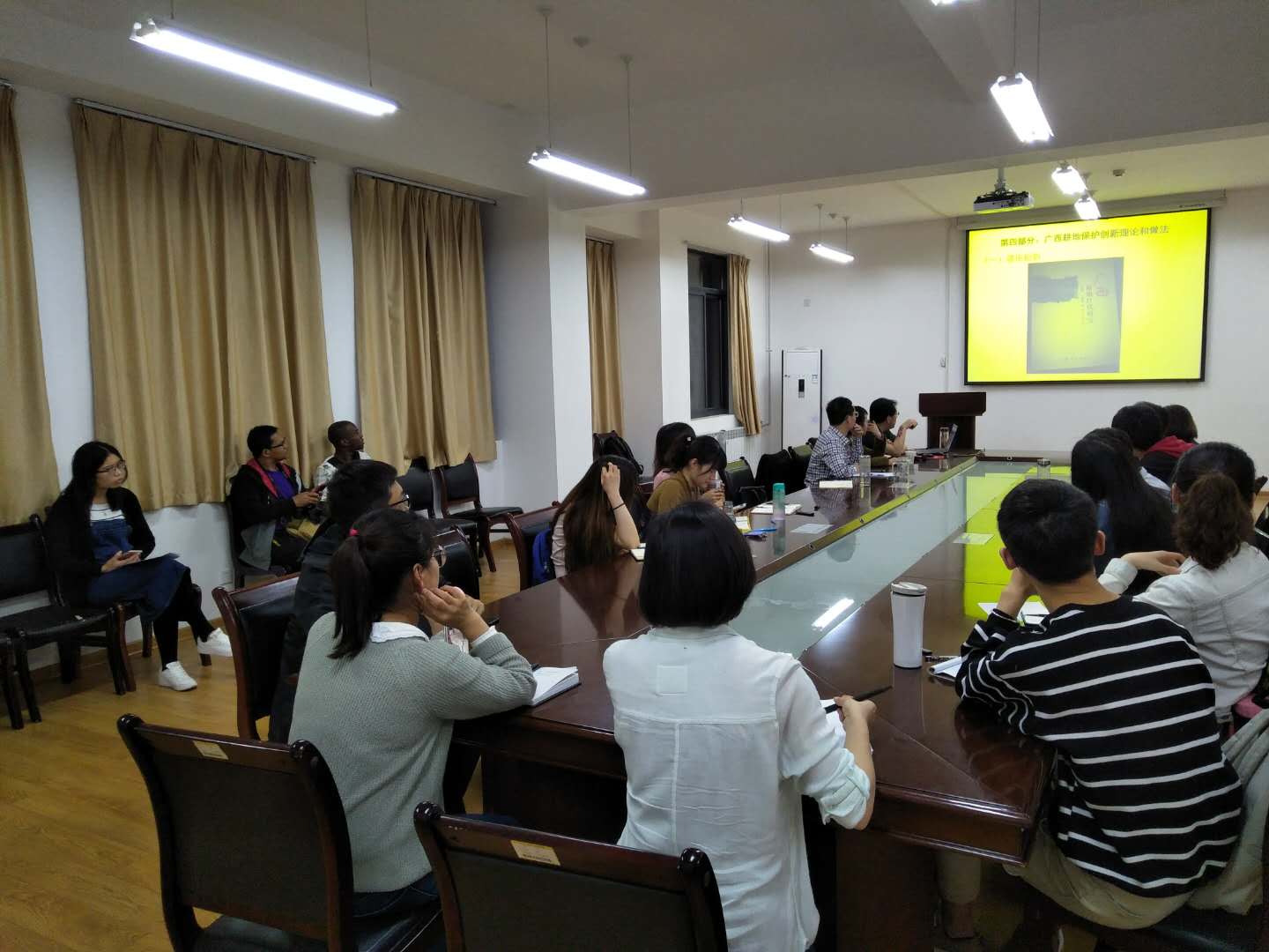 2018年4月19日晚上,在必赢76net线路唯一官方网站南校区经管学院C304,为全面践行“乡村振兴”战略,广西国土资源厅行政审批办公室主任左旭阳应邀为师生做“广西耕地保护实践与管理创新”的主题报告,经管学院副院长石宝峰主持报告会,土地资源管理专业张道军副教授、张会老师、张蚌蚌老师,硕士博士生和留学生等30余人一起聆听了报告会。