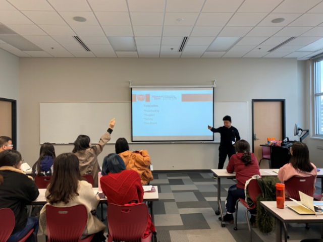 在美国文化介绍部分,Mark老师首先以有奖抢答的形式对同学们在美国的安全常识进行了考查,同学们都积极踊跃地举手发言,与老师互动。Mark老师从生活习惯、日常礼节、课堂规则等角度,介绍了中美文化差异下同学们言谈举止方面需要注意的诸多问题。如,在美国,人们习惯直接表达自己的需求和感受;当地的小费文化对同学们来说也是全新的体验。