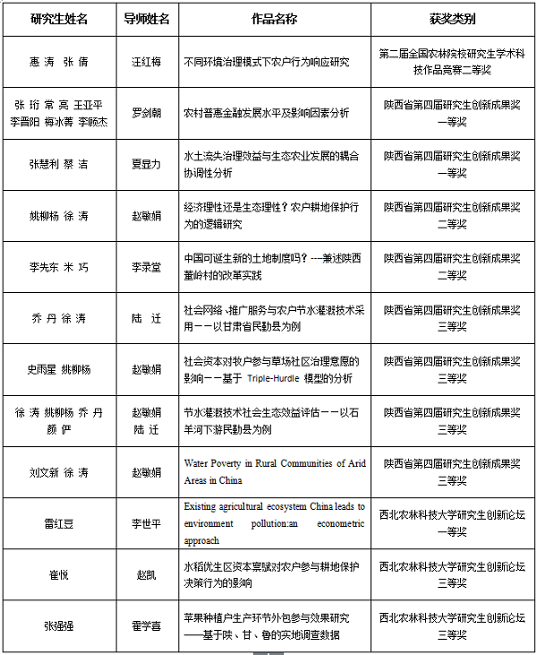 ——第二届全国农林院校研究生学术科技作品竞赛二等奖1项。2018年12月7日,由中国学位与研究生教育学会农林学科工作委员会主办,南京农业大学和南京林业大学承办的第二届全国农林院校研究生学术科技作品决赛在南京农业大学瀚苑宾馆顺利召开,必赢官网研究生惠涛等作为唯一入围团队,代表我校参加本次决赛。竞赛以“激发创新驱动,推动人才培养,增强社会服务,助力乡村振兴”为宗旨,经评委现场评审,惠涛等人完成的《不同环境治理模式下农户行为研究》喜获二等奖。