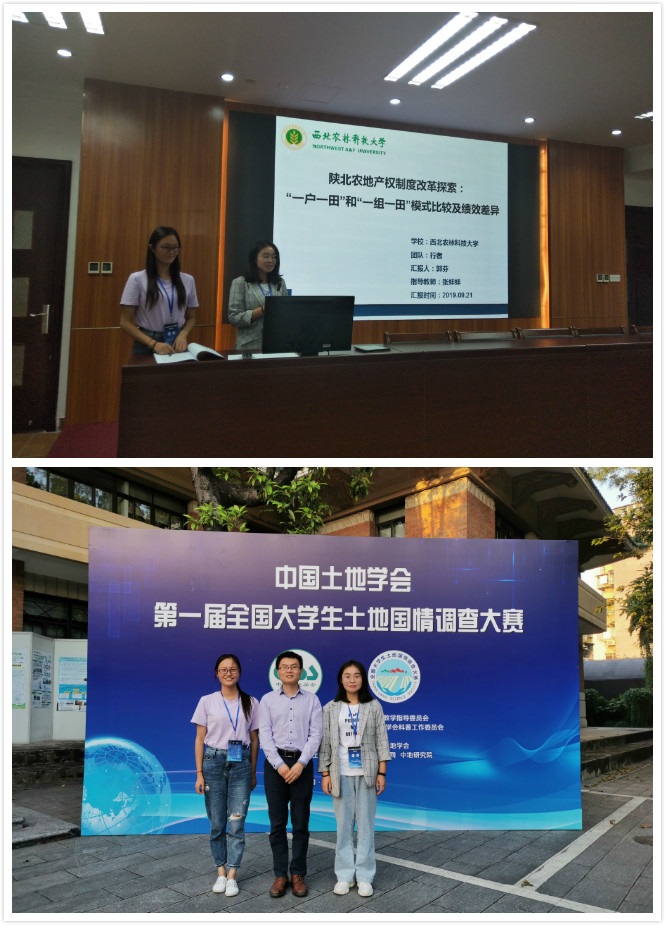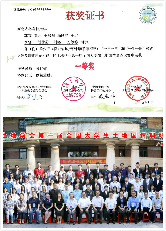 必赢官网土地资源管理专业2017级本科生郭芬、黄丹等领衔的行者团队在必赢官网青年教师张蚌蚌博士指导下,以“陕北农地产权制度改革探索:“一户一田”和“一组一田”模式比较及绩效差异”参赛作品入围决赛并荣获一等奖(奖金5000元)。该奖项的获得,有效锻炼了本科生的探索和研究能力,显著促进本科生加强专业课程学习并学以致用。队长郭芬感言,从确定题目、到问卷设计、到报告撰写,一次次的修改和制作PPT,多次的演练,成绩的取的离不开指导教师和陈海滨老师的悉心指导,感谢学院提供的平台。指导老师张蚌蚌说,“能够与东道主华南理工大学代表队,南京大学和浙江大学代表队共同获得一等奖,提升了我校在同行中的声誉;体现了本科生的卓越创新能力,培养了学生的爱国和恋土情怀,激发了学生探索认知祖国土地的激情”。