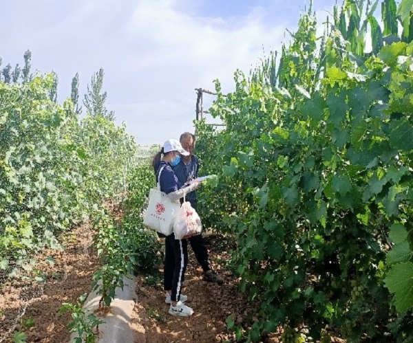 先锋村是一个以大青葡萄种植和观光基地闻名的村落,除经济作物外,农户也种植玉米等粮食作物,民风淳朴、热情。调研团队首先来到了先锋村村民委员会,了解相关村史和民俗,然后便分组进行调研。此时正处农忙时期,农户均在田间劳作,尽管烈日暴晒,宁夏调研组成员仍毅然前往田间地头开展调研工作,态度认真负责,获得了当地农户的认可,纷纷向调研组成员赠送自家种植的大青葡萄。