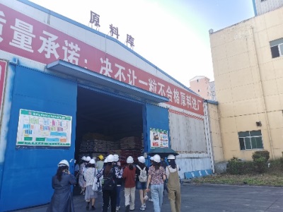 在公司业务人员的带领下,全体师生参观了公司的原料库、质检设施和生产流程。整个生产线采用中央集中控制,电子计算机配料、高效混合。在西北地区首次将小料添加纳入计算机配料管理系统,有膨化生产线一条和两条5粒生产线和独特的插承式成品防分级装置。化验室配备有高效液相色谱仪、原子吸收分光光度计等精密分析仪器。